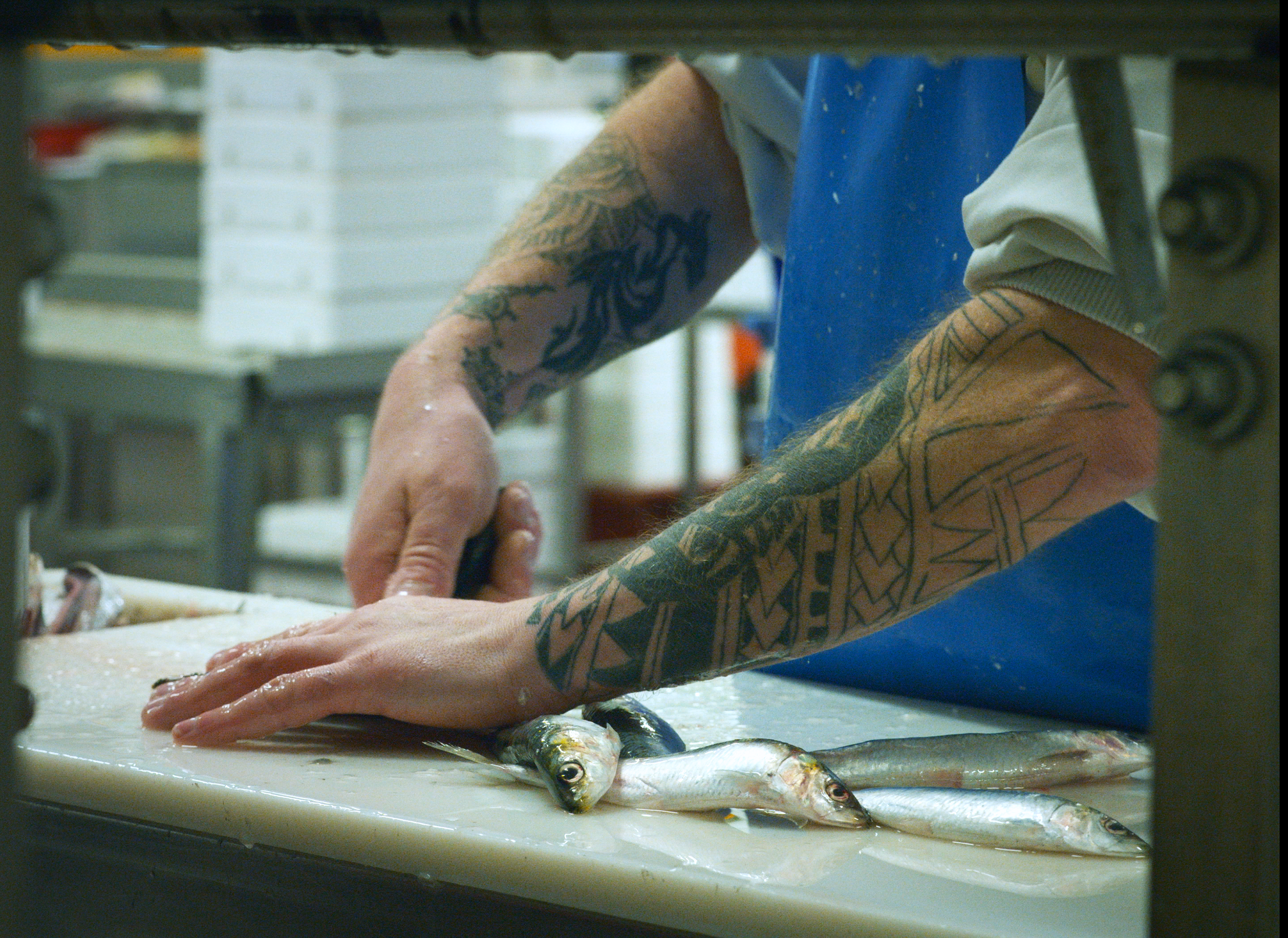 Sur le port de Boulogne sur-mer, dans une entreprise de mareyage semi-artisanal, les ouvriers apprêtent le poisson frais pour son acheminement, entier ou en filets. A la marée, on pèse, on emballe, on glace. Au filetage, on coupe.